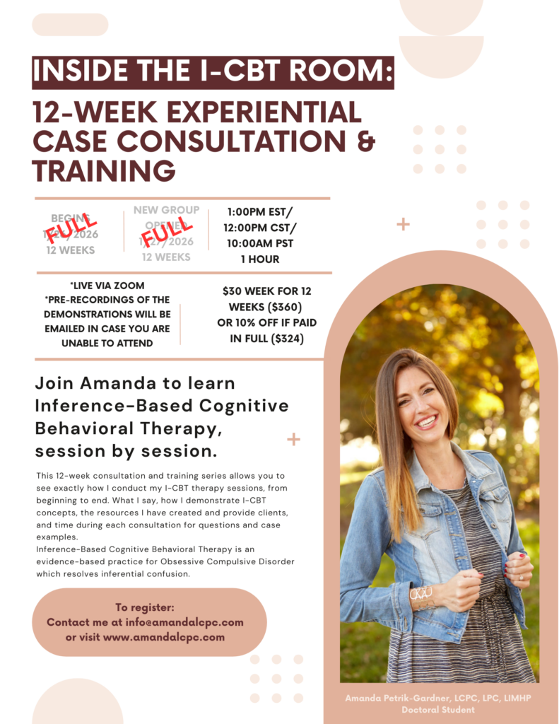 Clinical consultation, including case conceptualization, is available to professionals. This may include assistance with cases involving Obsessive Compulsive Disorder, Body Focused Repetitive Behaviors, or Anxiety Disorders. Clinical consultation is also offered to train individuals on treatments including Exposure & Response Prevention, Inference-Based CBT, Acceptance & Commitment Therapy, and the Comprehensive Behavioral Model, among other Cognitive Behavioral Therapy treatments.